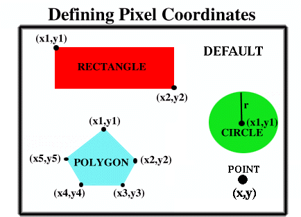 | CIRCLE | defines a circular region | requires the x,y coordinates of the center point and radius (in pixels); x,y r |